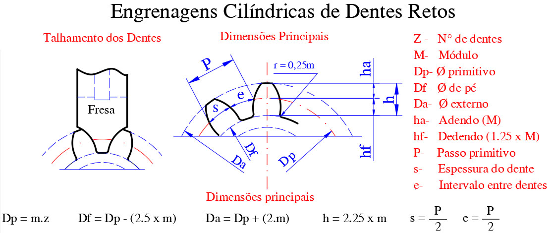 | m | z | Dp = m.z | Passo = (dp x pi) / z | ha = 1,00 x m | hf = 1,25 x m | Da = dp + 2.m | Df = dp - 2.5 x m | s = passo / 2 |